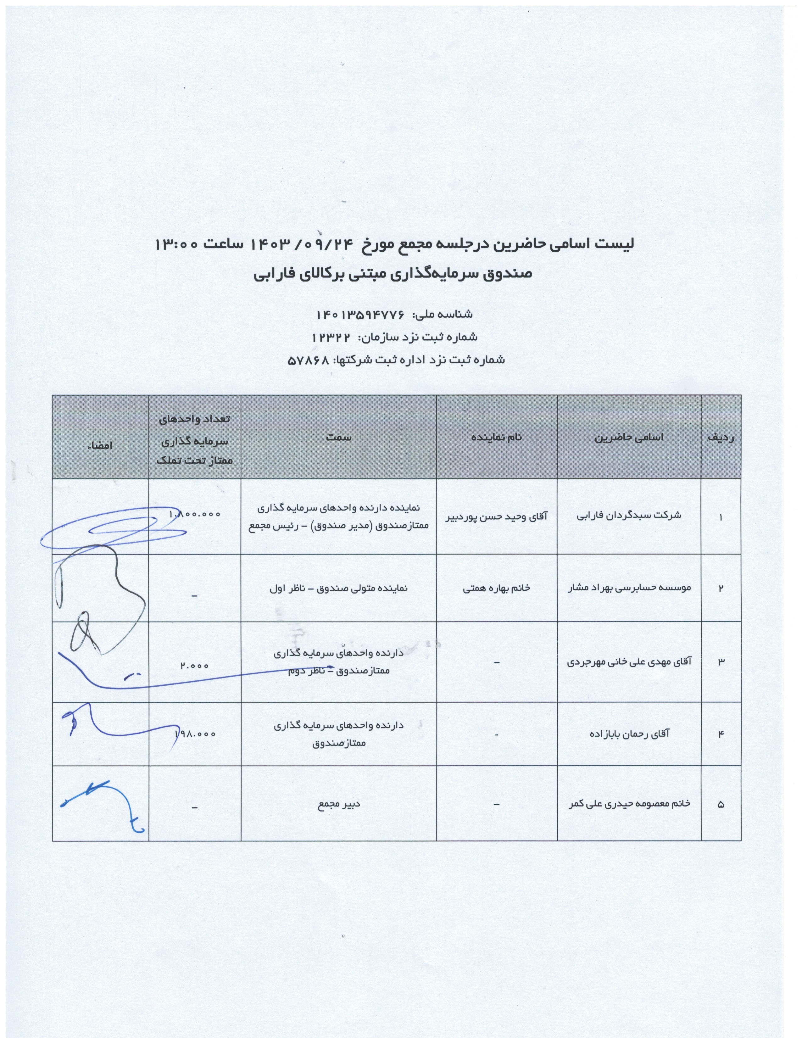 لیست اسامی حاضرین در مجمع مورخ ۱۴۰۳/۰۹/۲۴ ساعت ۱۳:۰۰ - مجمع تصمیم گیری در خصوص افزایش سقف تعداد واحدهای سرمایهگذاری