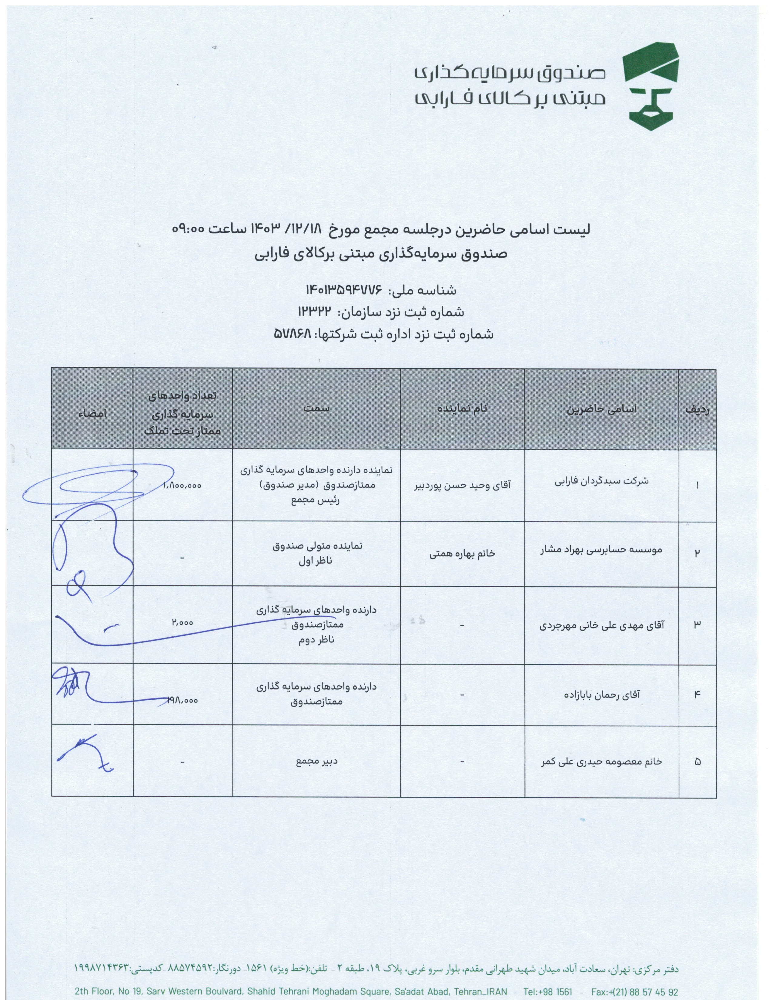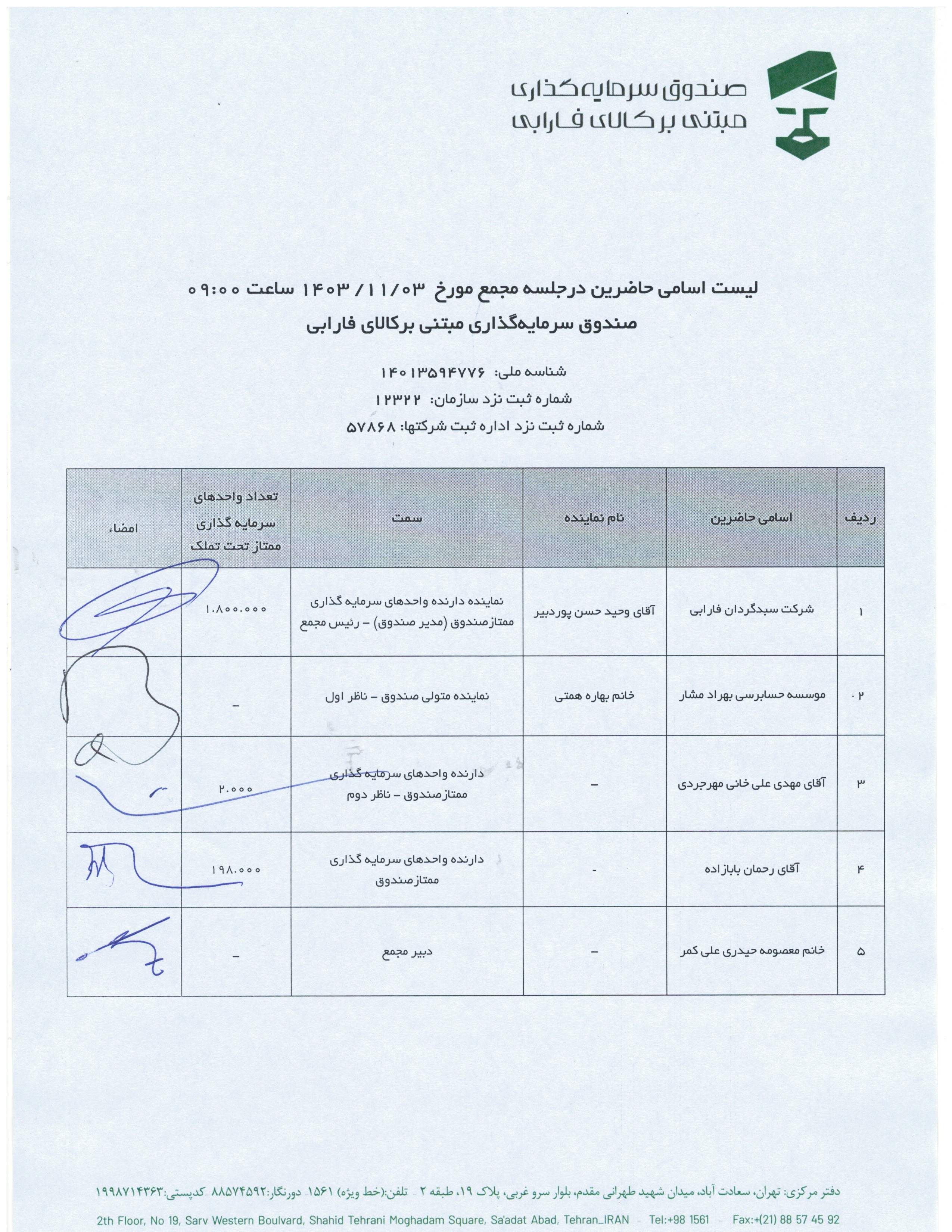 لیست اسامی حاضرین در مجمع مورخ ۱۴۰۳/۱۱/۰۳ ساعت ۰۹:۰۰ - تصمیمگیری در خصوص افزایش سقف تعداد واحدهای سرمایهگذاری