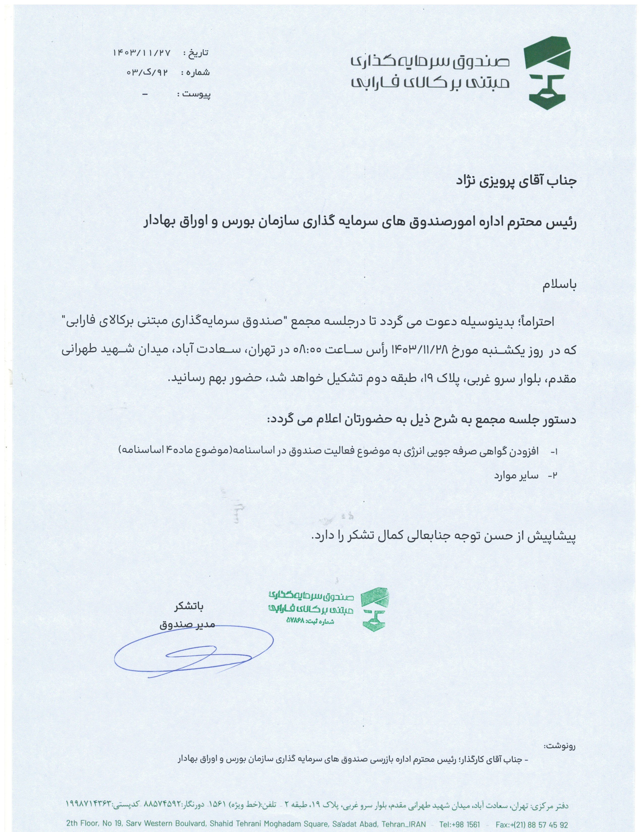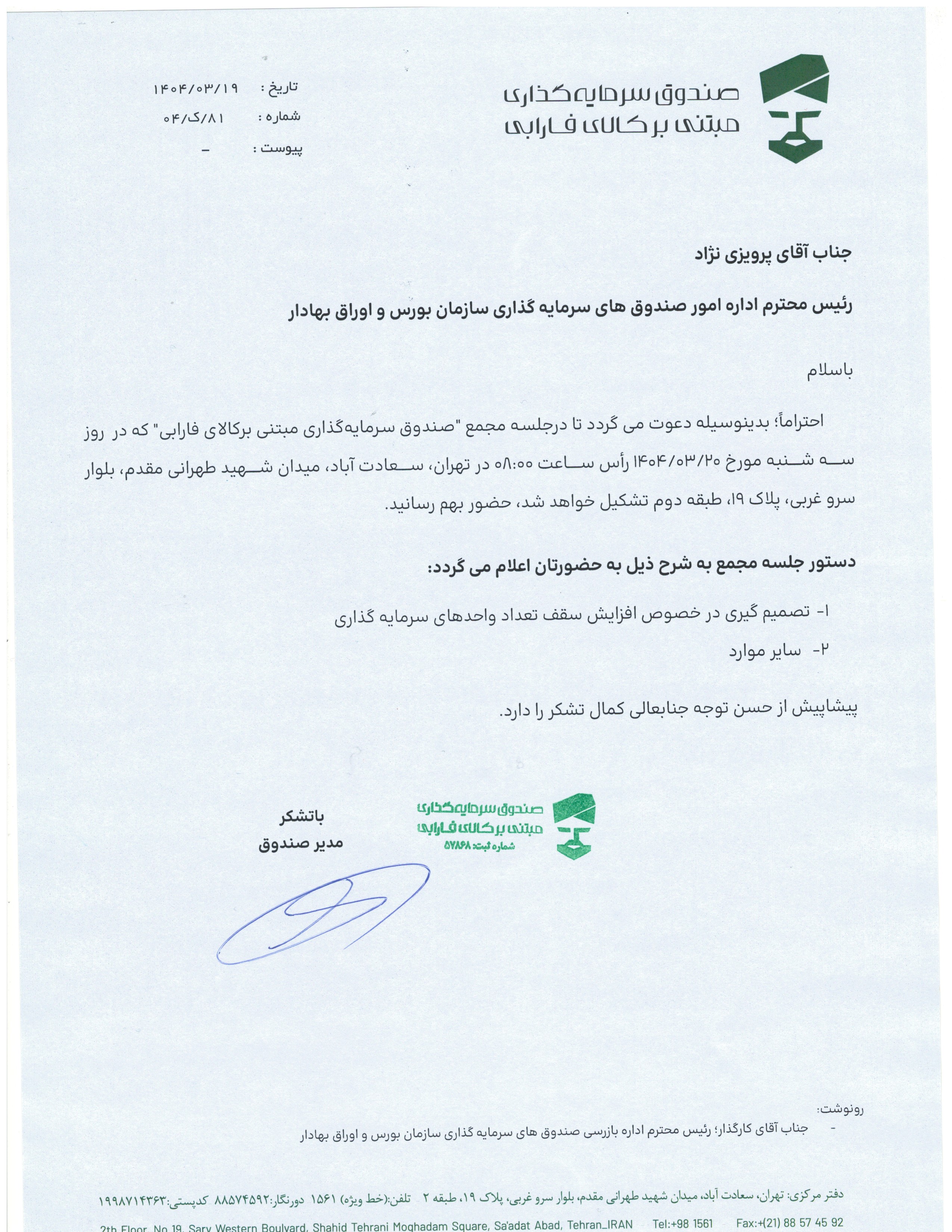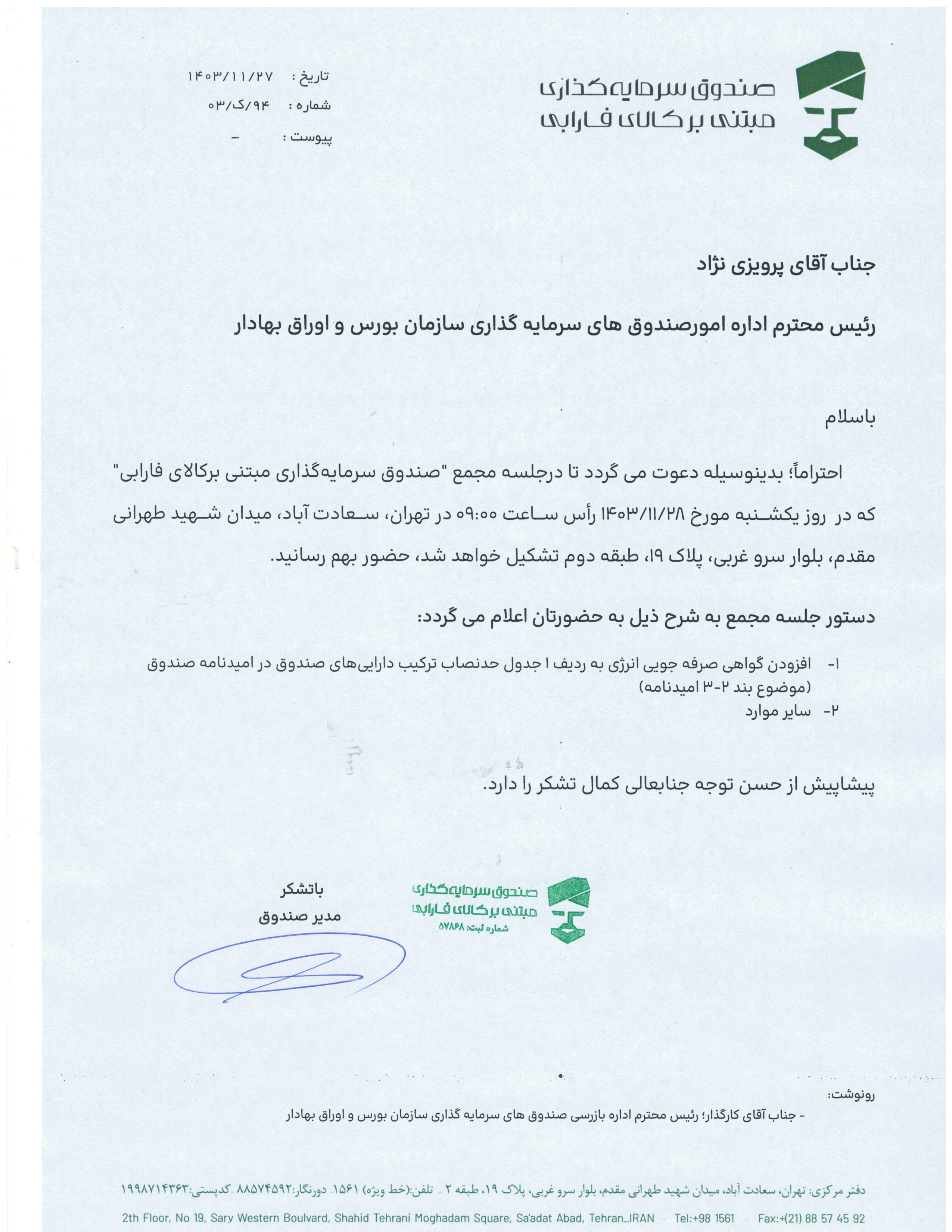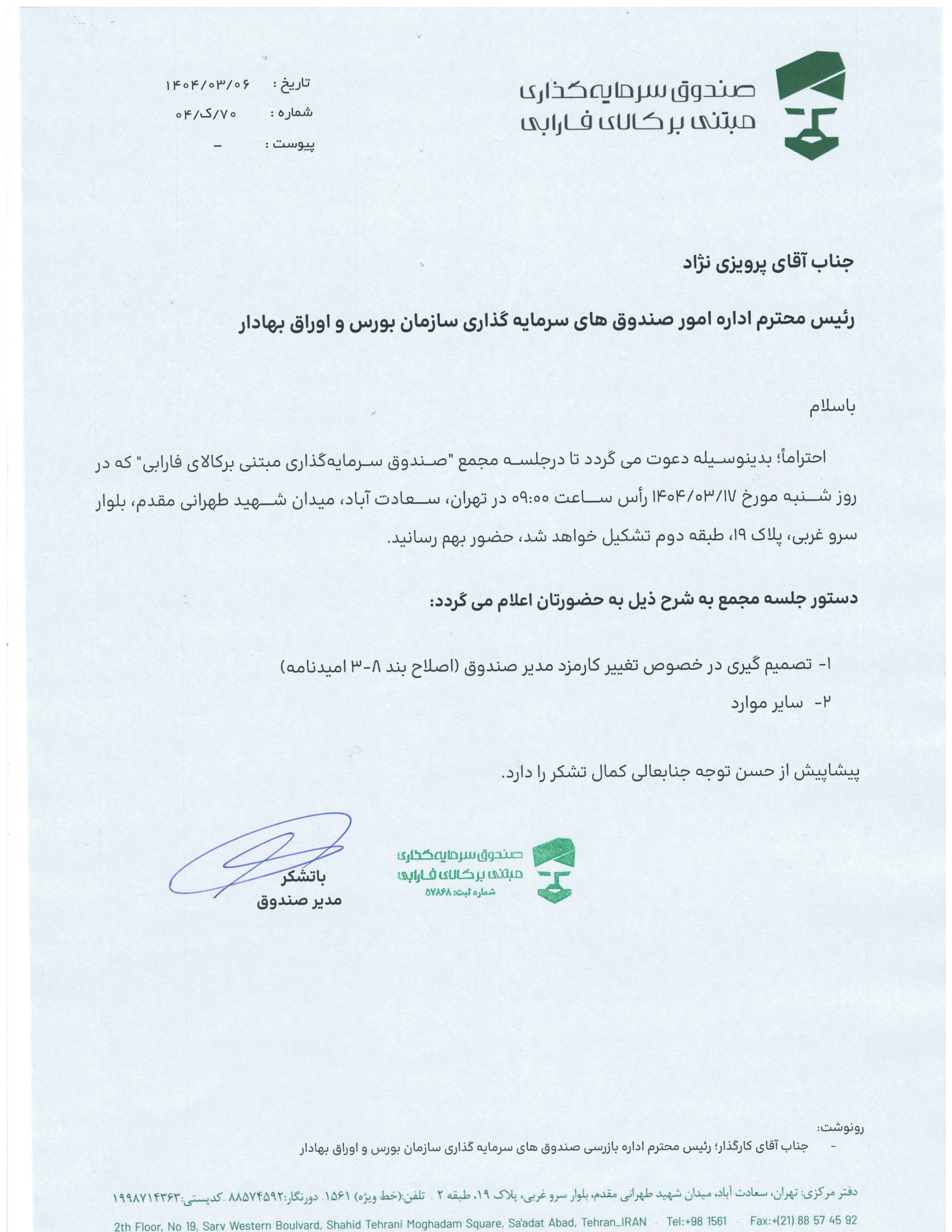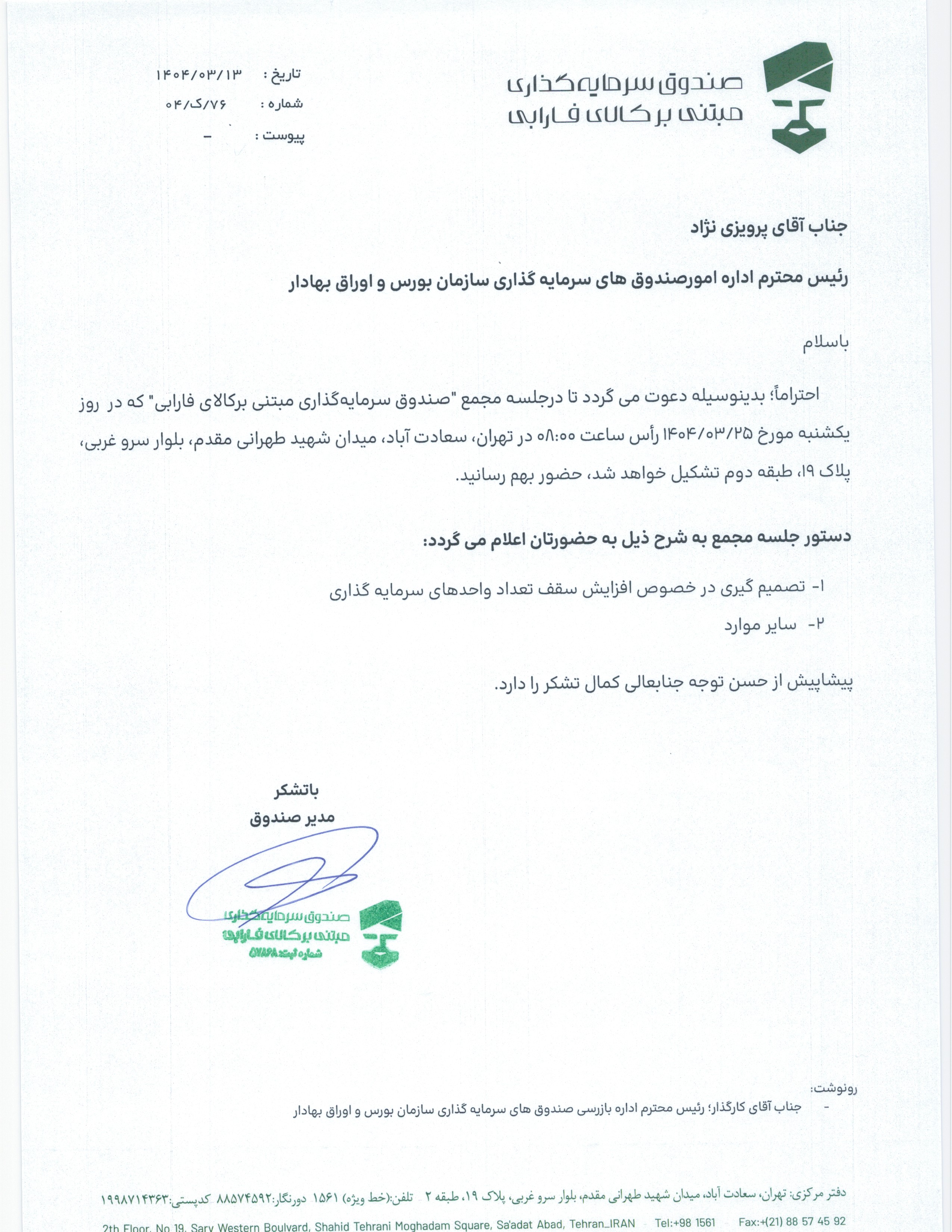 آگهي دعوت به مجمع مورخ ۱۴۰۴/۰۷/۲۰ ساعت ۱۱:۰۰ - مجمع ساليانه صندوق مبتني بر کالاي فارابي