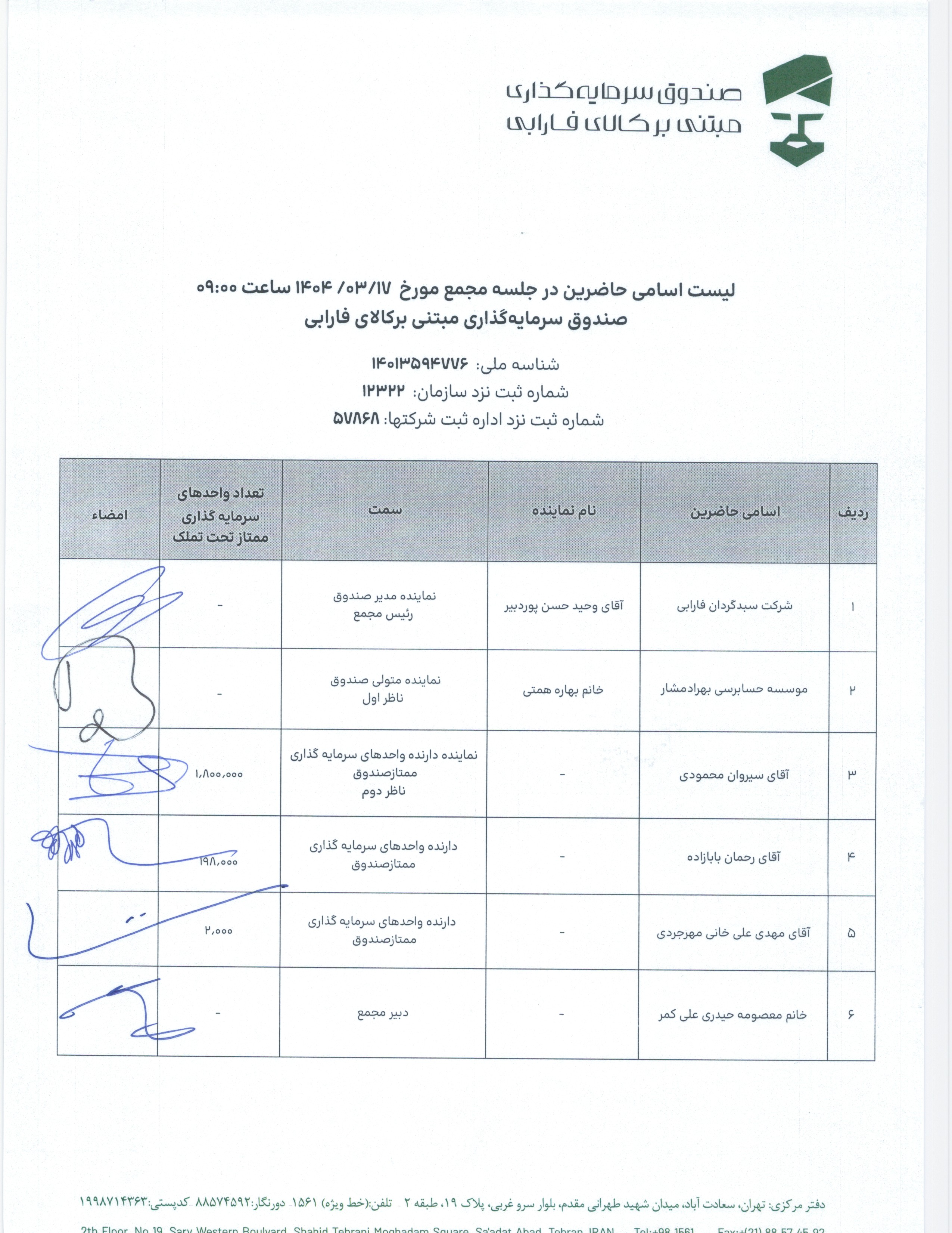 لیست اسامی حاضرین در مجمع مورخ ۱۴۰۴/۰۳/۲۰ ساعت ۰۸:۰۰ - تصميم گيري در خصوص افزايش سقف واحدهاي سرمايهگذاري