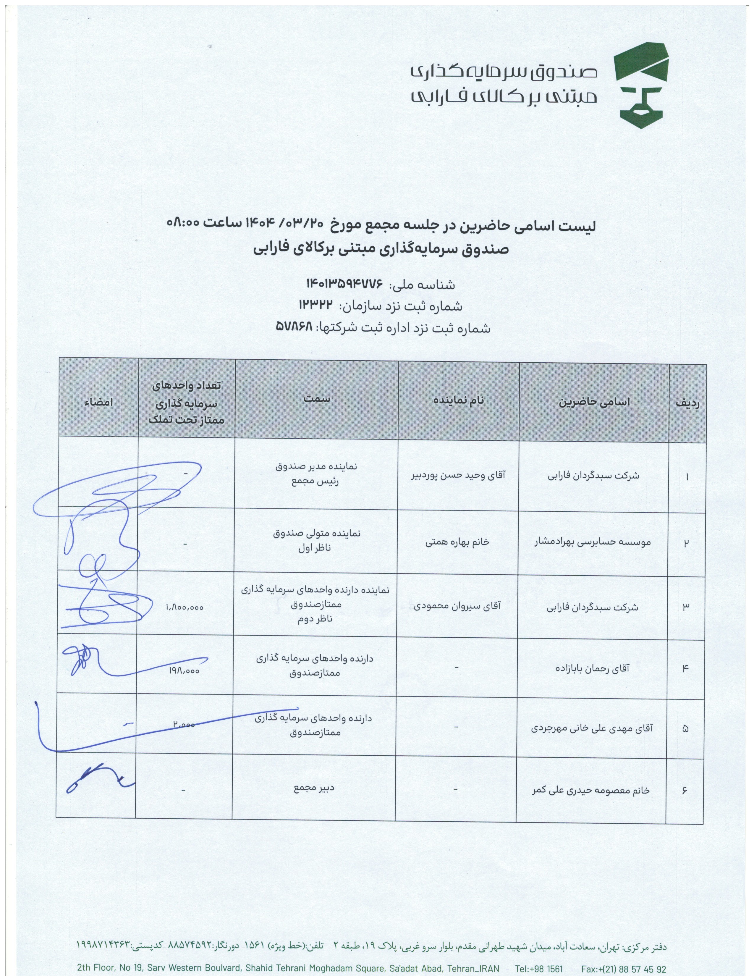 اسامی حاضرین مجمع مورخ ۱۴۰۴/۰۷/۲۰ ساعت ۱۱:۰۰ - مجمع ساليانه صندوق مبتني بر کالاي فارابي